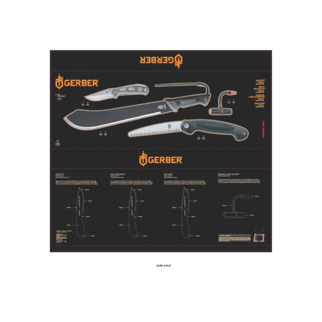 GET READY AND SURVIVE! This unique Gerber kit will surely be the perfect helper in your struggle for survival. The Gator Bolo machete , the Gerber Fire starter, and the Gator EAB hand saw with the stylish Airlift Black fastener create four tools to conquer almost every obstacle. You cut your way, cut firewood, light a fire, and the small, lightweight Airlift closer is ready for smaller and easier jobs.