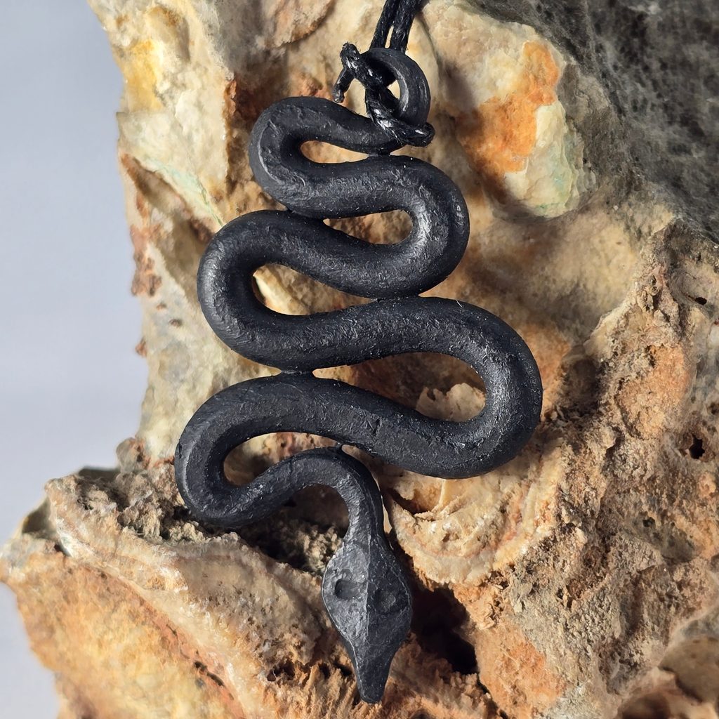 Handgeschmiedeter Anhänger in Form einer Schlange aus Stahl. Die Form entsteht durch Erhitzen und allmähliches Verformen des Metalls mit einem Hammer, wodurch die Oberfläche eine natürliche Textur erhält und jedes Stück leicht unterschiedlich ist.