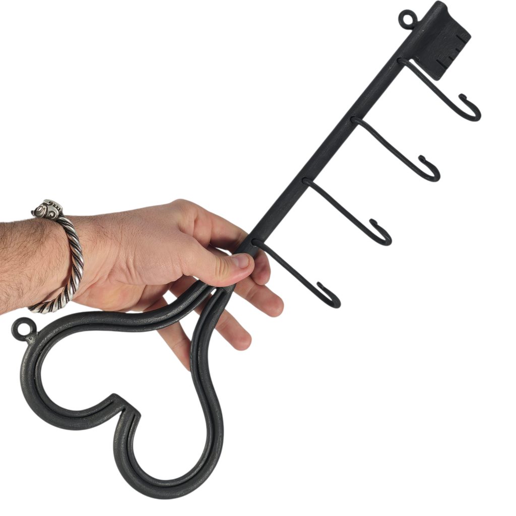 Handgeschmiedeter Wandaufhänger aus massivem Material, hat vier Haken, die zum Aufhängen von Mänteln, Jacken, Taschen oder Schlüsseln geeignet sind.