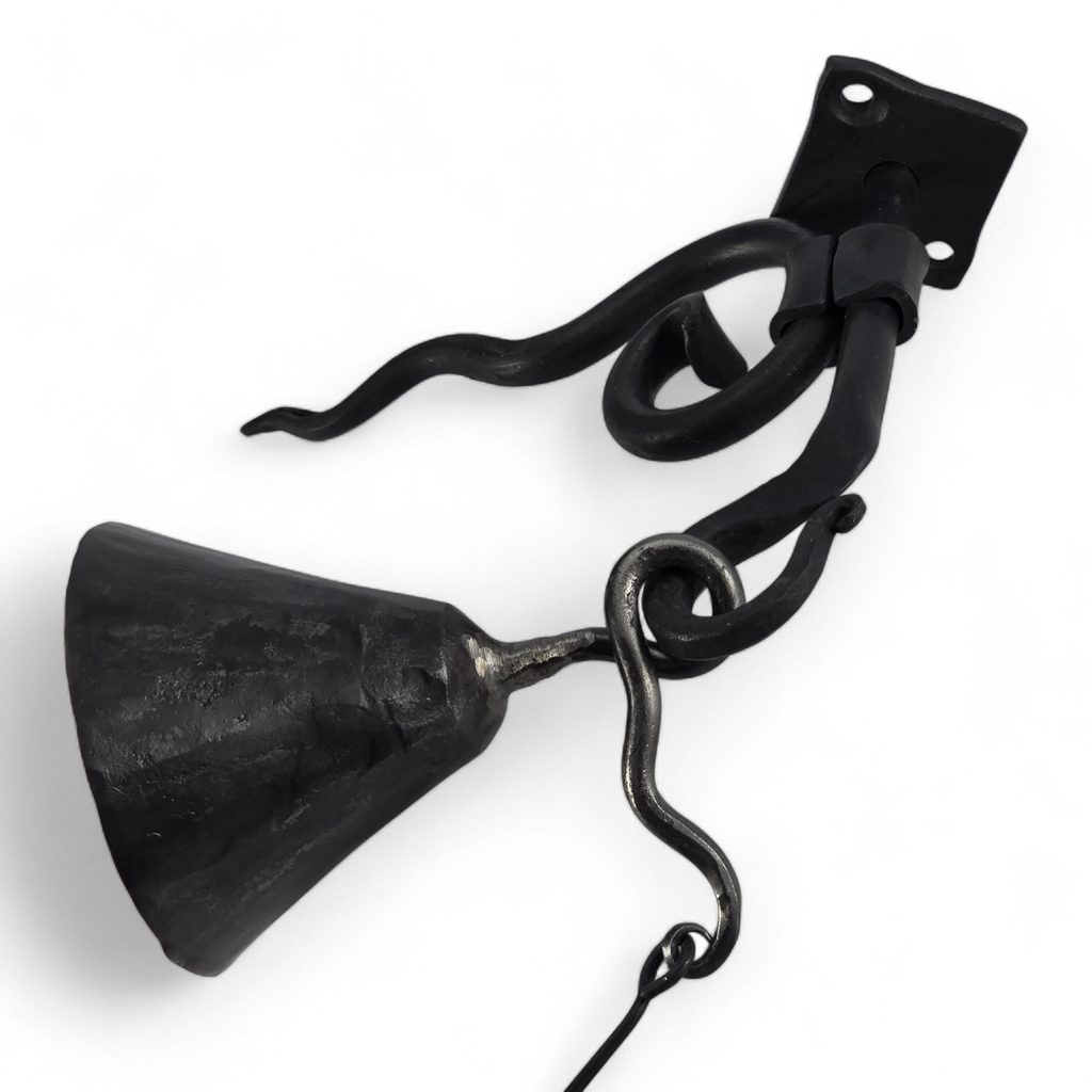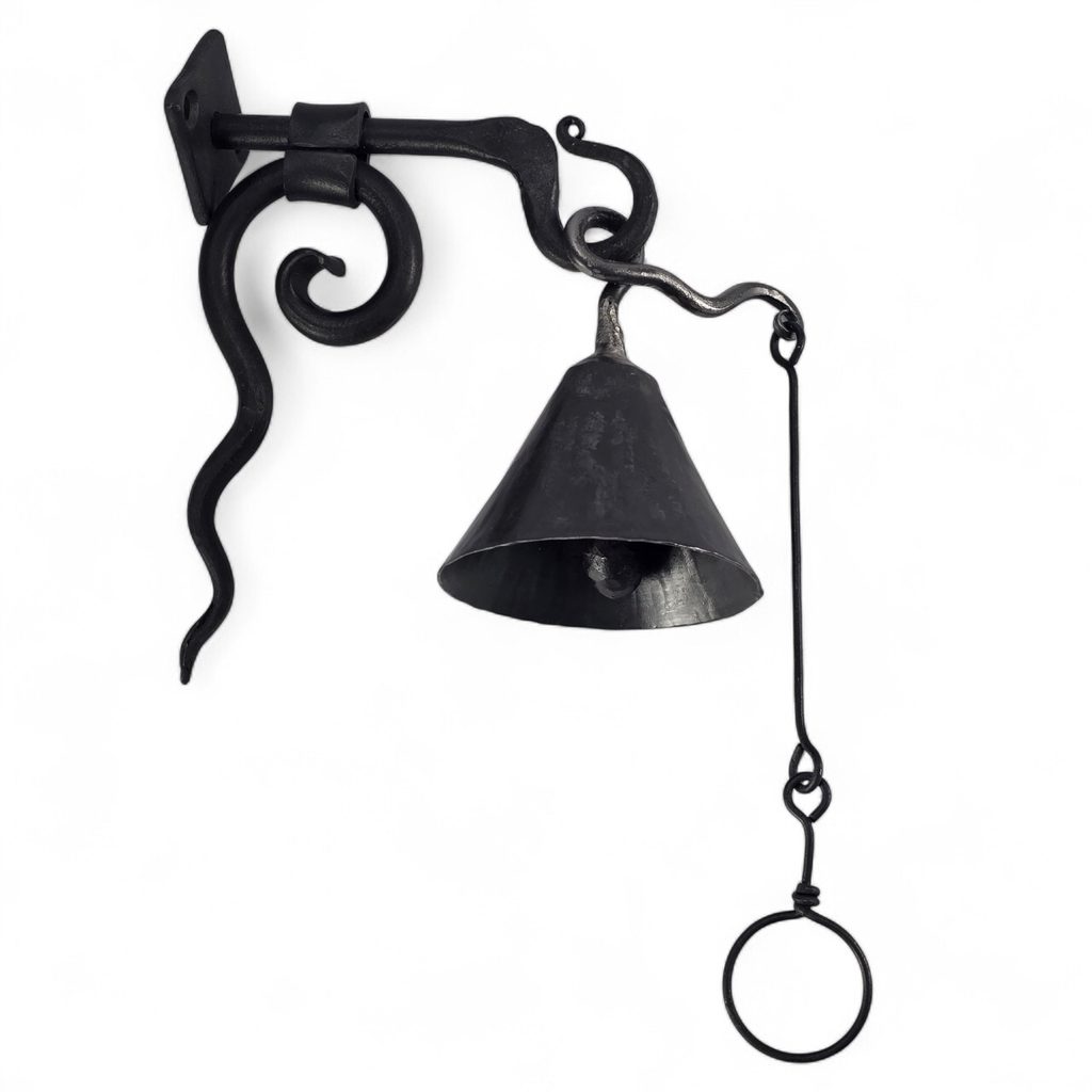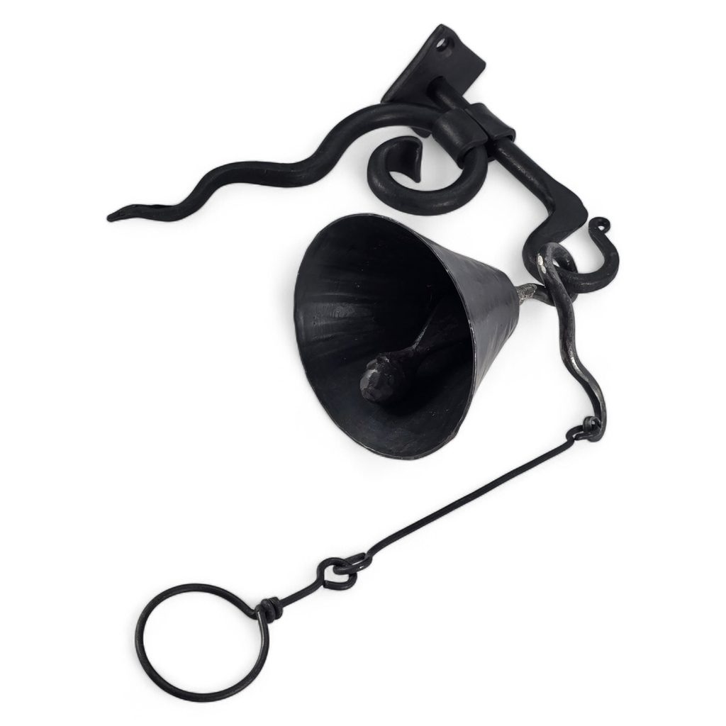 Diese kleine Glocke ist keine moderne Dekoration aus einer Fabrik. Es ist ein Stück ehrliche Schmiedearbeit, von tschechischen Schmieden von Hand gefertigt. Ziehen Sie einfach am Ring und die Glocke ertönt deutlich.
