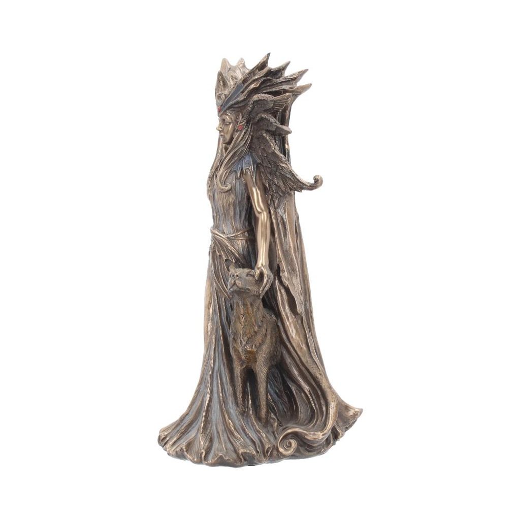 Die Skulptur ist aus hochwertigem Kunstharz gefertigt und mit Bronze überzogen, wodurch der Eindruck eines antiken Artefakts entsteht. Dank ihrer Höhe von 25 cm passt sie perfekt auf einen Tisch, ein Altarregal, in ein Interieur mit mythologischer, esoterischer oder gotischer Atmosphäre.