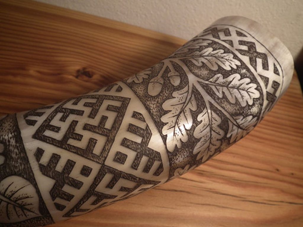 Engraved Drinking HORN inspired by Slavic embroidery with half of the Sun symbol in a triangle and large swastika. Oak is in Slavic mythology associated with male Gods while linden tree is usually connected with Goddesses.