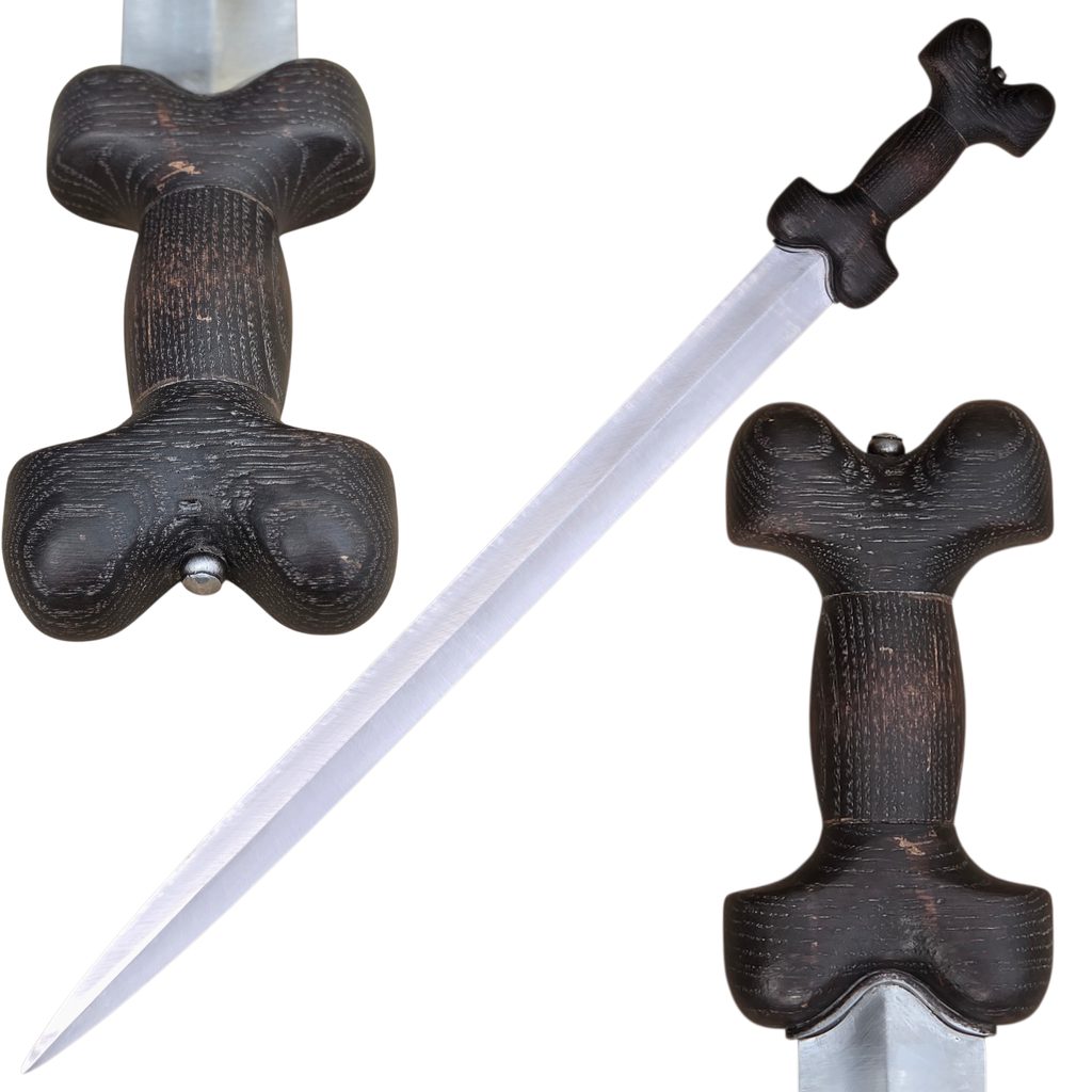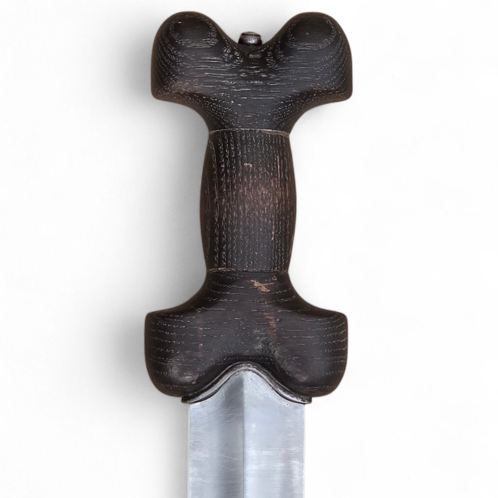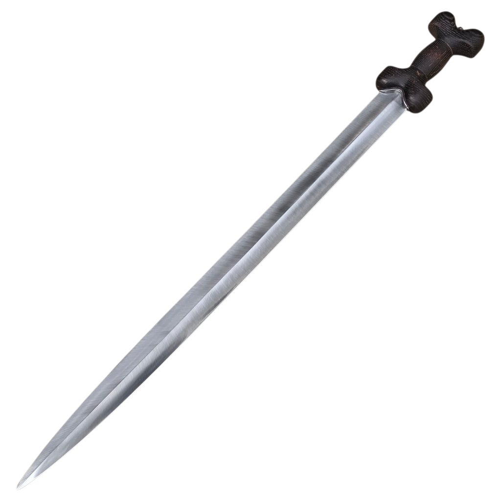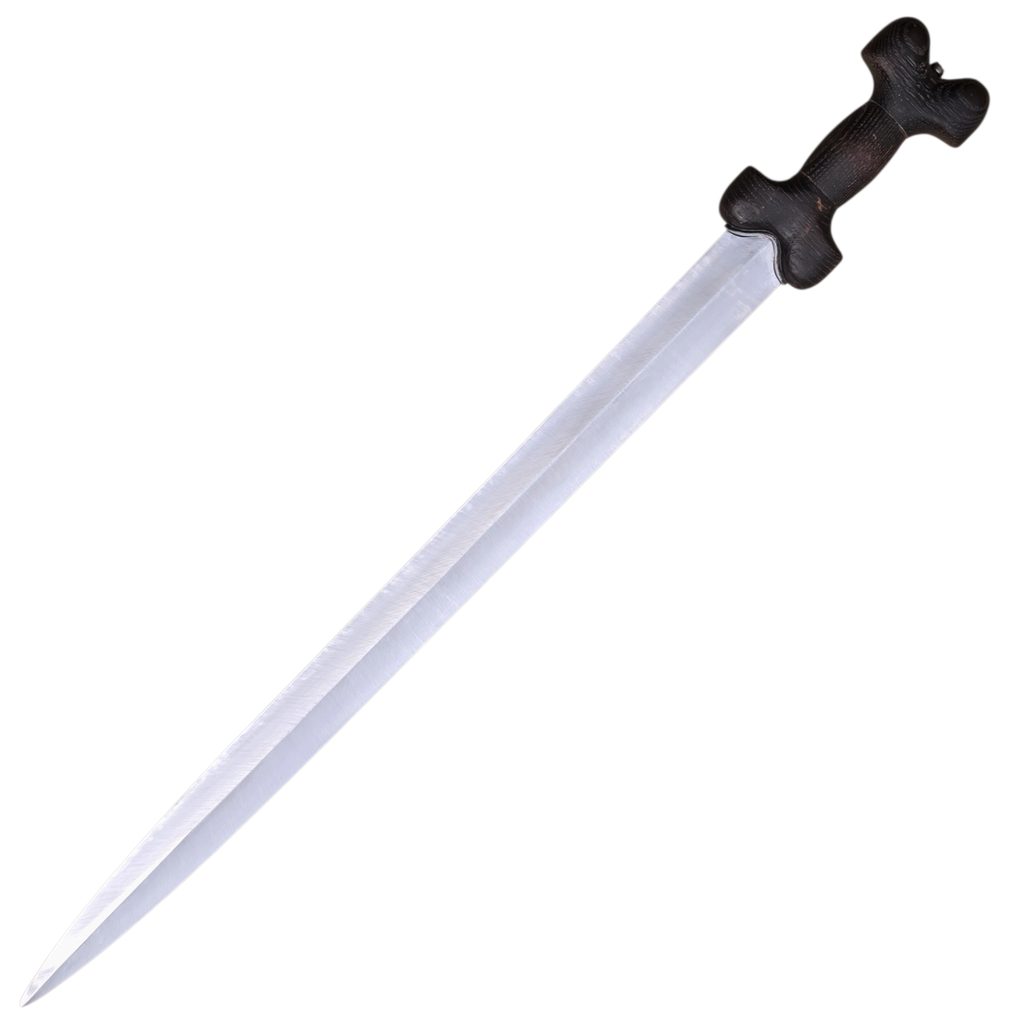 Das Schwert La Tène B war eine der erfolgreichsten Waffen der Antike und hatte seinen Ursprung bei den keltischen Stämmen im 4. Jahrhundert v. Chr. Es war eine äußerst vielseitige Waffe, die sich sowohl zum Hacken als auch zum Zielen eignete, mit einer Klingenlänge von etwa 60-70 cm und einem typischen linsenförmigen Querschnitt. Aufgrund seiner hochwertigen Verarbeitung und seines fortschrittlichen Designs war es ein technologisch fortschrittlicher und relativ teurer Gegenstand, der zunächst vor allem für die Kriegerelite bestimmt war.
