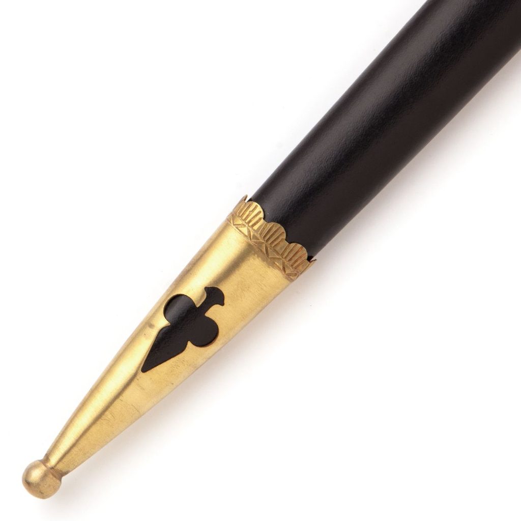 Die Scheide ist aus einem lederbezogenen Holzkern gefertigt. Die Spitze der Scheide ist mit einer Messingspitze mit einer traditionellen Aussparung verstärkt. Der obere Teil des Leders verbreitert sich und bedeckt einen Teil der Parierstange an der Fehlschärfe.