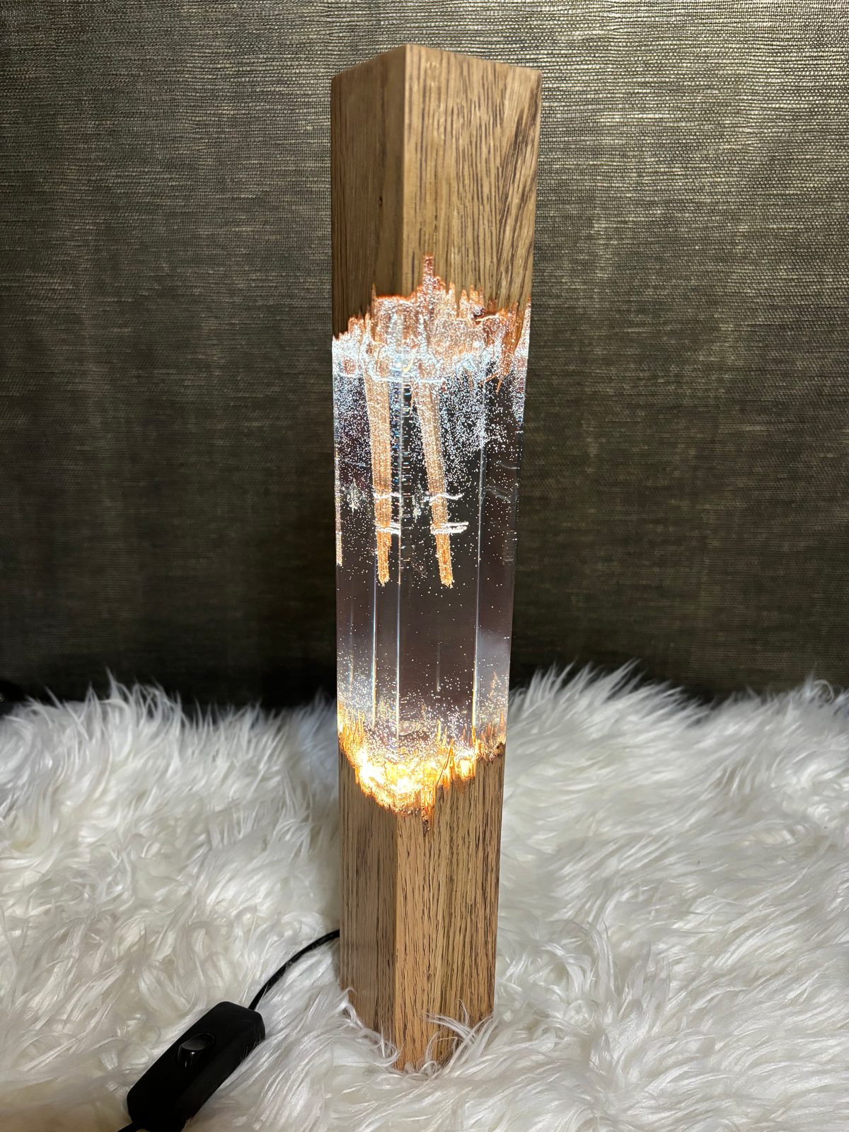 Kerzenlampe aus Holz und Harz. Größe ca. 40cm 5x5cm Sockel. Eichenholz. Mit dunklem Farbton. Stromanschluss 230/12V, Verbrauch 1,9W. Vollständig austauschbare LED-Lampe.