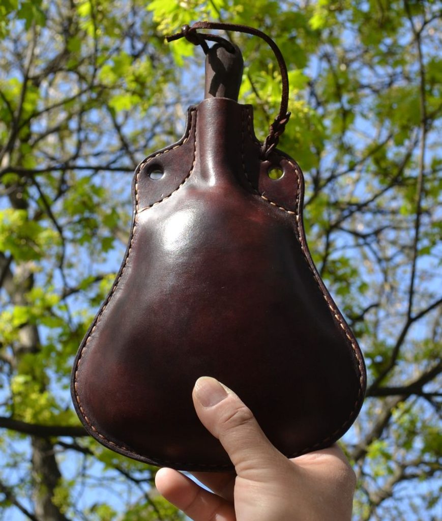 The LEATHER BOTTLE. Volume cca 0.75 L. This product is made by the same technology as it always used to be in the past - inner surface is covered by wax. Because of European strict hygienic laws and rules we sell this item as a decoration. Usable from ancient times to the Middle ages.