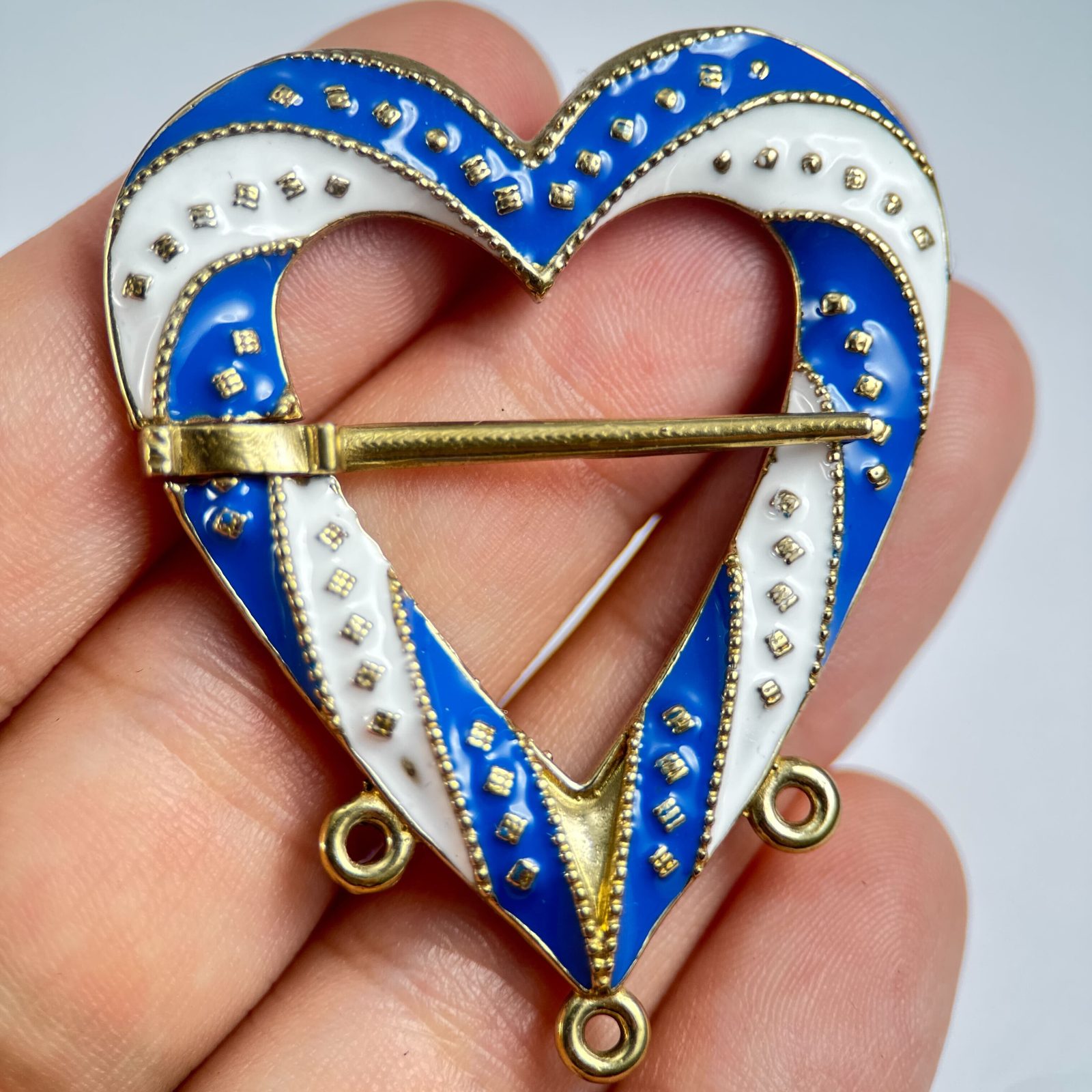 Mittelalterliche Anstecknadel aus Kaltemaille nach einem Muster aus den Sammlungen des British Museum. Sie hat drei Schlaufen zum Aufhängen von Schmuck. Auf der Rückseite befindet sich eine emaillierte Inschrift: "Je suy vostre sans de partier" (Ich gehöre für immer dir).