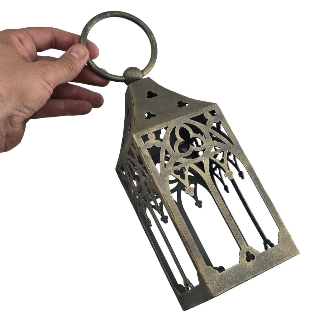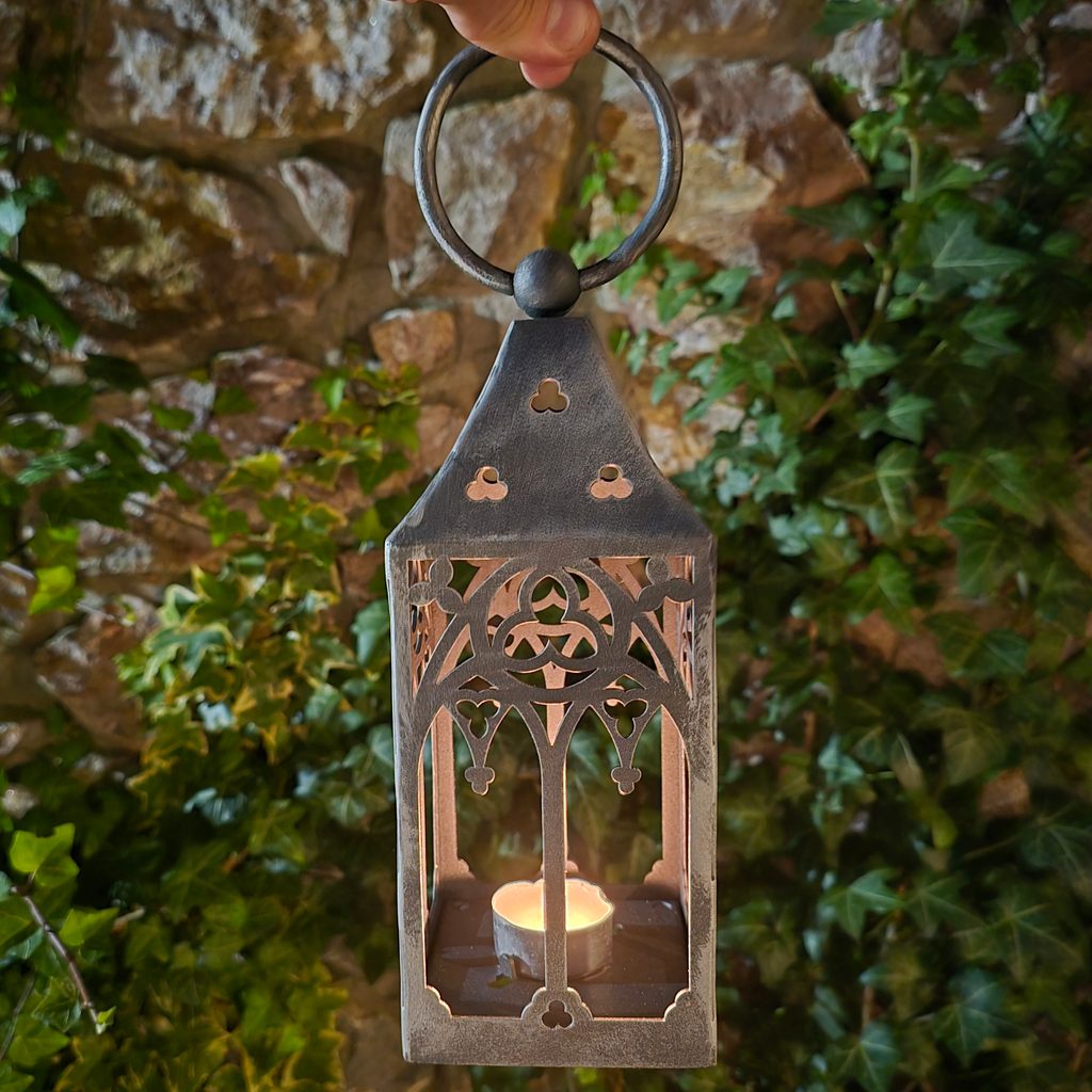 Eine mittelalterliche Eisenlaterne, die für ein Teelicht in einem coolen Gothic-Design angepasst wurde. Die Inspiration durch gotische Kunst und mittelalterliche Schlösser ist offensichtlich :) Sie wird Ihrem Haus oder Garten Atmosphäre verleihen.