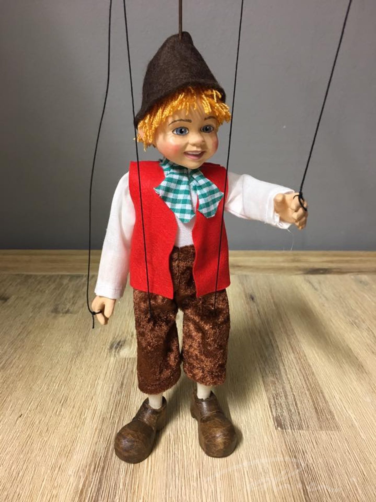 Stilvolle Marionette, die wir in unserer Werkstatt Hansel getauft haben. Es symbolisiert einen Jungen, gekleidet in traditionellen bayerischen Trachten mit Lederhose und Weste. Führungssystem, bestehend aus einer Wippe, Draht und Faden ermöglicht eine perfekte Steuerung aller Bewegungen dieser schönen Puppen.