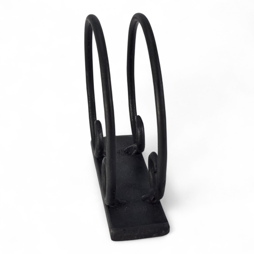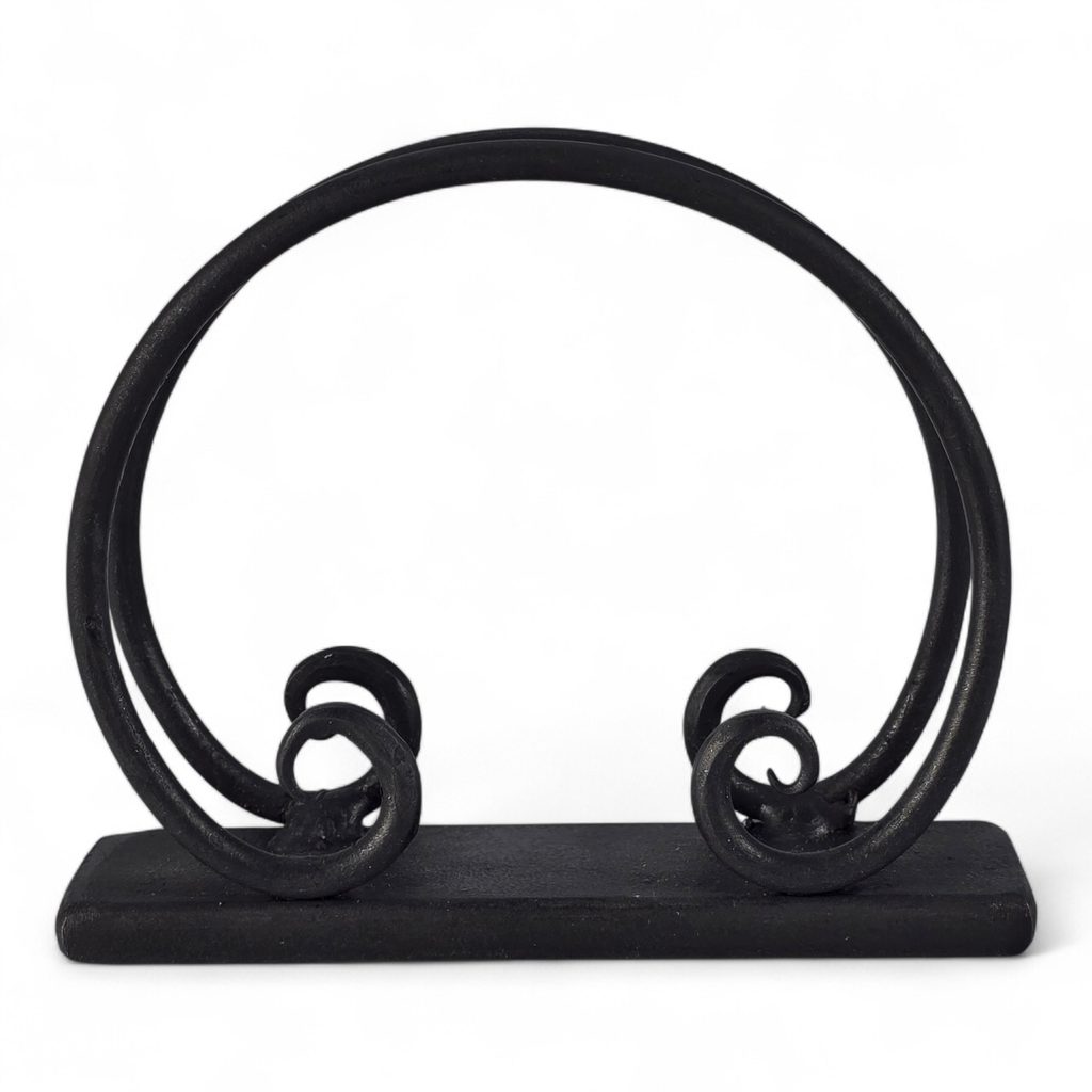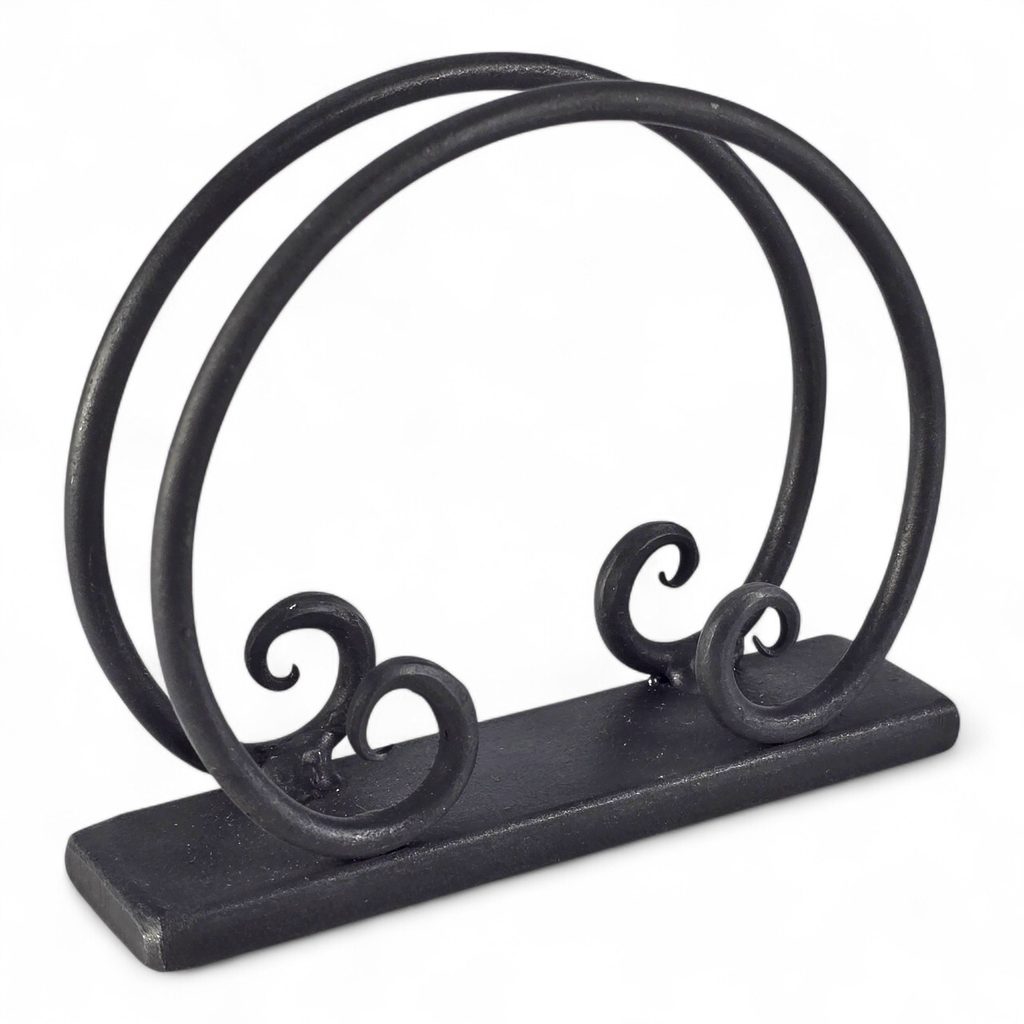 Dieser handgeschmiedete Serviettenhalter ist ein Tischaccessoire, das Sie zu Hause oder im Restaurant schätzen werden. Die beiden Bögen aus massivem Stahl bilden einen harmonischen Rahmen, der die Servietten sicher hält und gleichzeitig anmutig aussieht.