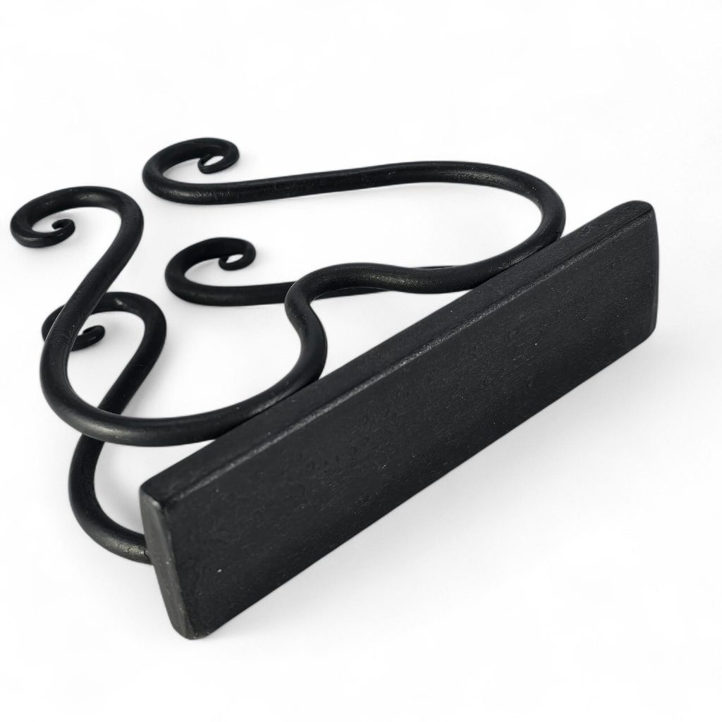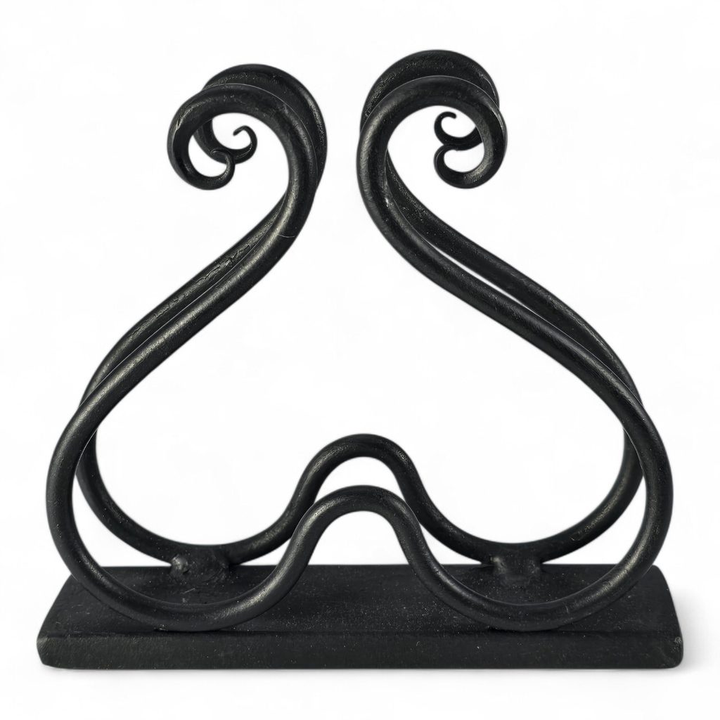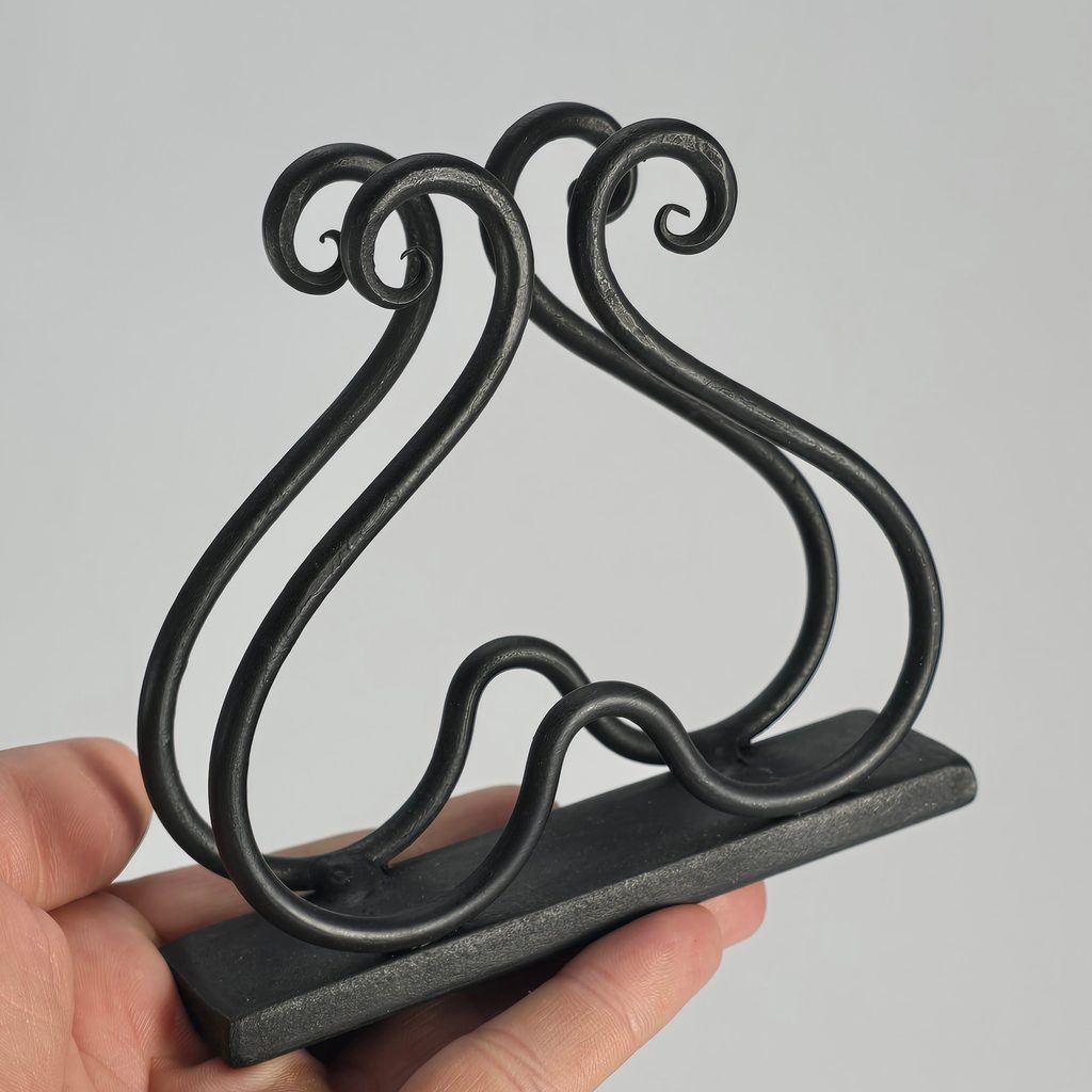 Dieser handgeschmiedete Serviettenhalter ist ein Tischaccessoire, das Sie zu Hause oder im Restaurant schätzen werden. Geschmiedete Spiralen aus massivem Stahl bilden einen Rahmen, der die Servietten sicher hält und gleichzeitig elegant aussieht.
