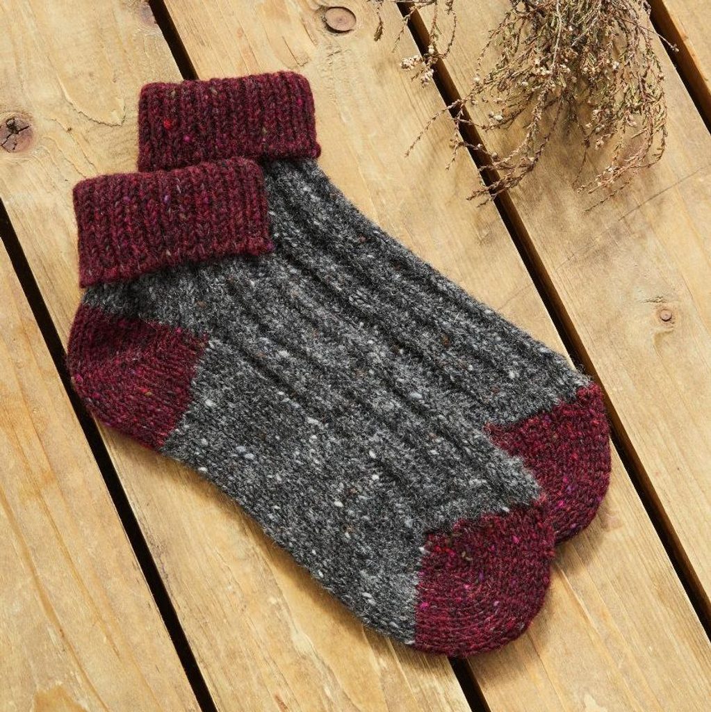 Praktische Socken aus 100% reiner Schurwolle mit Knöchelbündchen. Diese farbenfrohen gerippten Socken haben eine kontrastierende Farbe an der Spitze, der Ferse und dem gerippten Bündchen. Geeignet als Geschenk oder als Souvenir. Entworfen in Irland. 100 % reine Schurwolle.