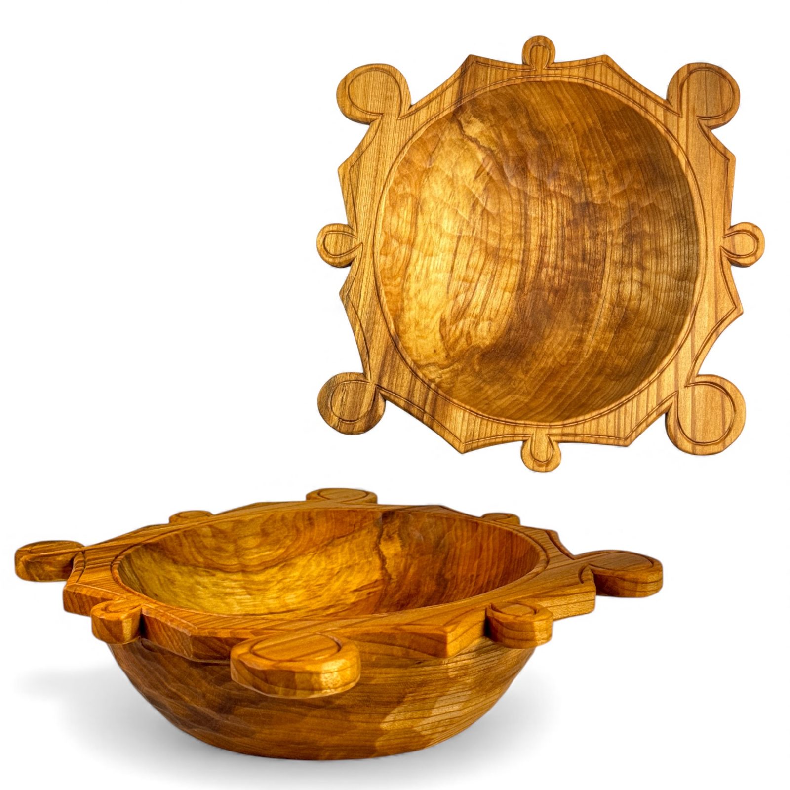 Replik einer von den Wikingern geschnitzten und verzierten Holzschale vom Schiff Oseberg - Norwegen. Sehr detaillierte Handwerkskunst von einem Schnitzer aus den Karpaten, wo dieses Handwerk eine lange Tradition hat.